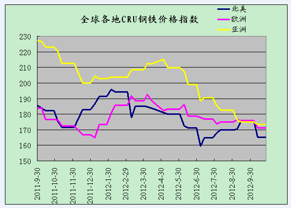 據國際鋼鐵協會公布的數據顯示,全球9月粗鋼產量為1.24億噸,較上年同期幾乎沒有變化。如果扣除中國產量增長,實際上國際粗鋼產量和消費在金融經濟危機中是回落的。這從一個側面驗證了世界經濟的嚴峻性。同時也驗證了國際鋼材和鐵礦石的需求疲軟。