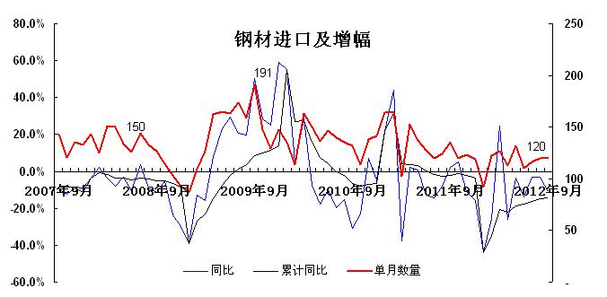 9月中國政府1萬億投資拉動,使經濟下滑趨勢得到遏制,并逐步出現了走穩的趨勢,也為國內陷入深跌的鋼材市場價格反彈提供了機會。9月以來,中國鋼廠提高了鋼材出口報價。熱卷價格從500美元(FOB)提高到530美元。隨著歐美的量化寬松和中國鋼材出口報價提高,也刺激國際鋼材市場出現了價格回升。其中歐洲熱卷從460歐元/噸漲到490歐元/噸。美國的熱卷從570美元/短噸提高到580美元。從美國10月下旬的粗鋼周產量167.9萬短噸,比去年同期減少11.2萬短噸,產能利用率僅僅為67.9%看,歐美市場的疲軟震蕩趨勢并沒有改變。既然危機并沒有過去,因此,近期鋼材價格小幅回升并不意味著國際鋼材市場回暖。但畢竟增加了市場信心的穩定度。也為國際市場今年冬季鋼材價格穩定創造了條件。
