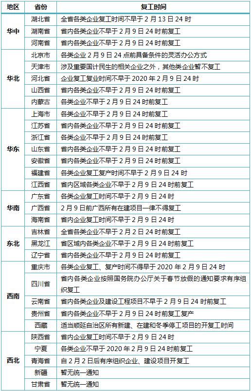 總體上,除湖北省企業(yè)復工時間為不早于2月13日24時外,各地企業(yè)節(jié)后上班時間普遍為不早于2月9日24時,也就是2月10日正常上班。甘肅省和新疆維吾爾自治區(qū)尚未在省級層面發(fā)布延遲通知。