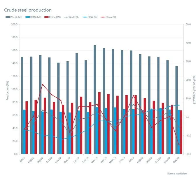 2023年12月全球71個納入世界鋼鐵協會統計國家的粗鋼產量為1.357億噸,同比下降5.3%。
