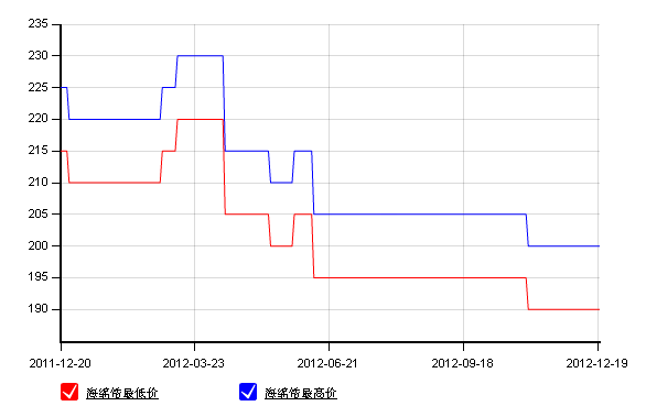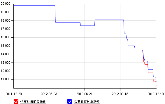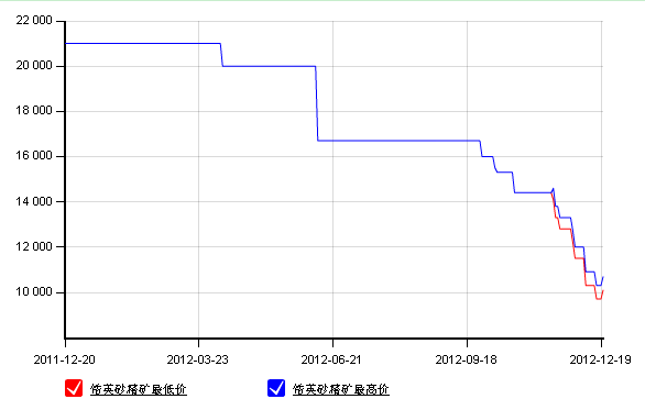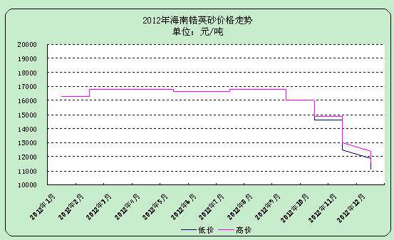 從5月底市場價格小幅下滑,期間市場雖然仍有波動,但是漲落幅度很小。9月底開始價格明顯下跌,10月初市場報價在16000-16000元/噸,整個四季度,海南鋯英砂價格持續(xù)下滑,截止12月下旬市場報價跌至11100-11600元/噸。