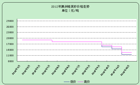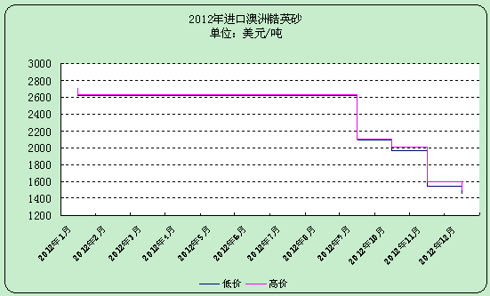 年初進(jìn)口澳大利亞鋯英砂(ZrO2 66%minCIF)價格從2700-2710美元/噸,小幅下滑至2620-2630美元/噸,至9月上旬市場價格一直維持平穩(wěn),中旬開始價格明顯下滑,截止12月下旬,價格跌至1300-1350美元/噸,跌幅已經(jīng)超過100%。