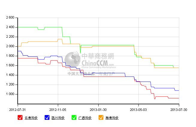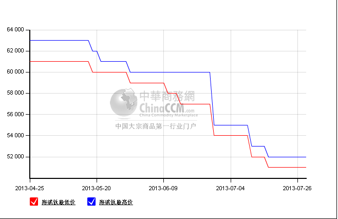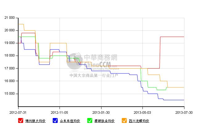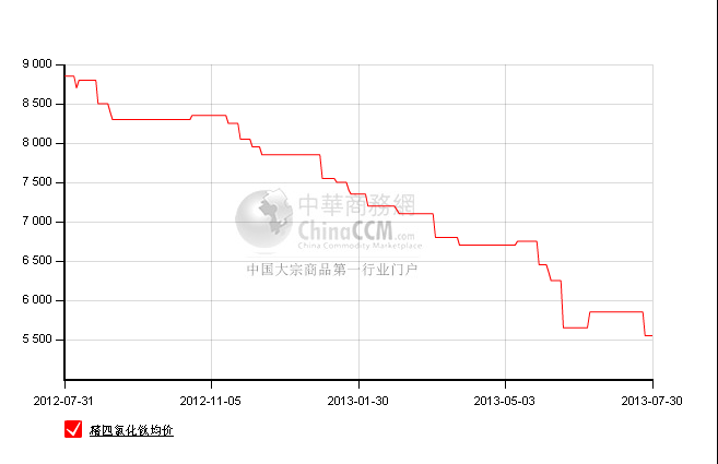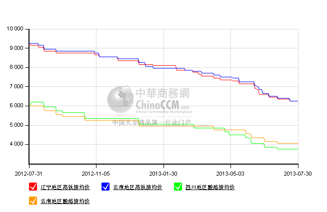 四氯化鈦:在7月里,價格出現震蕩下調,目前價格暫穩,由于下游市場需求低迷,由于6月廠家的提價行為未能形成漲勢,以及夏季需求淡季的到來,四氯化鈦市場面臨較大下行壓力。目前廠家走貨平穩,但由于鈦白粉、海綿鈦等市場的低迷,四氯化鈦商家對后市多持看跌的態度。