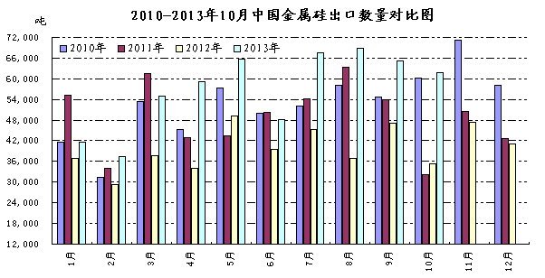 2013年1-10月,中國(guó)累計(jì)出口金屬硅約57萬(wàn)噸,2012年1-10月累計(jì)出口量約39萬(wàn)噸。自金屬硅出口關(guān)稅取消后,走私明顯減少,從下表中可以看出,今年每月出口量均高于去年同期,3、4月出口量均在5萬(wàn)噸之上,而5月出口量一舉突破6萬(wàn)噸。今年以來(lái)國(guó)際大環(huán)境并不樂(lè)觀,1-2月出口市場(chǎng)清淡,隨著新年過(guò)后,外商陸續(xù)入市采購(gòu),3-5月出口市場(chǎng)明顯好轉(zhuǎn),不過(guò)據(jù)了解部分出口商以金屬硅名義出口硅鐵,從而出口量有所增加。6月出口數(shù)量不足5萬(wàn)噸,而7-10月出口數(shù)量均超過(guò)6萬(wàn)噸,雖然7月、8月處于國(guó)外夏休時(shí)節(jié),但受國(guó)內(nèi)市場(chǎng)價(jià)格走高帶動(dòng),出口市場(chǎng)詢盤及采購(gòu)活躍,一些商家也在陸續(xù)準(zhǔn)備第四季度訂單,因此整體出口情況較為樂(lè)觀。