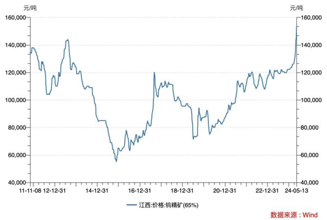 Wind數(shù)據(jù)統(tǒng)計(jì)顯示,江西65%品位鎢精礦5月13日均價(jià)位為15.35萬元/噸,較年初已上漲25%,創(chuàng)下自2013年以來的新高。