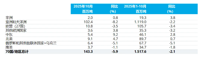 2025年10月全球70個納入世界鋼鐵協(xié)會統(tǒng)計國家/地區(qū)的粗鋼產(chǎn)量為1.433億噸,同比下降5.9%。