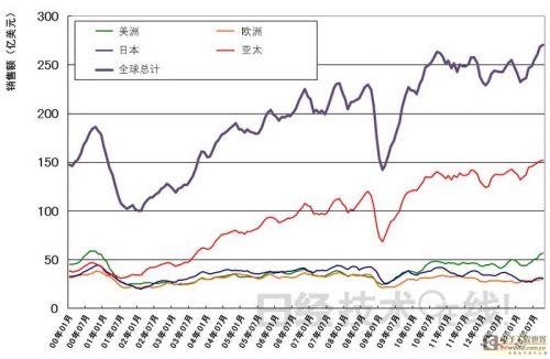 全球及各地區(qū)的單月半導(dǎo)體銷售額(3個(gè)月的移動(dòng)平均值)走勢(shì)(數(shù)據(jù)提供:SIA及WSTS;制圖:《日經(jīng)電子》)。