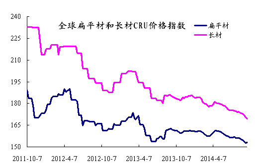上周國際鋼市持續整體走低。CRU國際鋼價綜合指數為157.74,CRU扁平材指數為152.94,CRU長材指數為169.56,北美市場CRU價格指數為179.64,歐洲市場CRU價格指數為153.25,亞洲市場CRU價格指數為151.08。