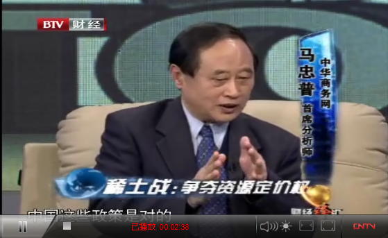 2012年4月8日北京電視臺財經節目《財經峰匯》播發了專題節目:稀土戰:爭奪資源定價權。中華商務網首席分析師馬忠普作為應邀嘉賓參加了訪談節目制作。在此之前,曾應邀回答了編輯楊揚提出的關于稀土之爭的問題。